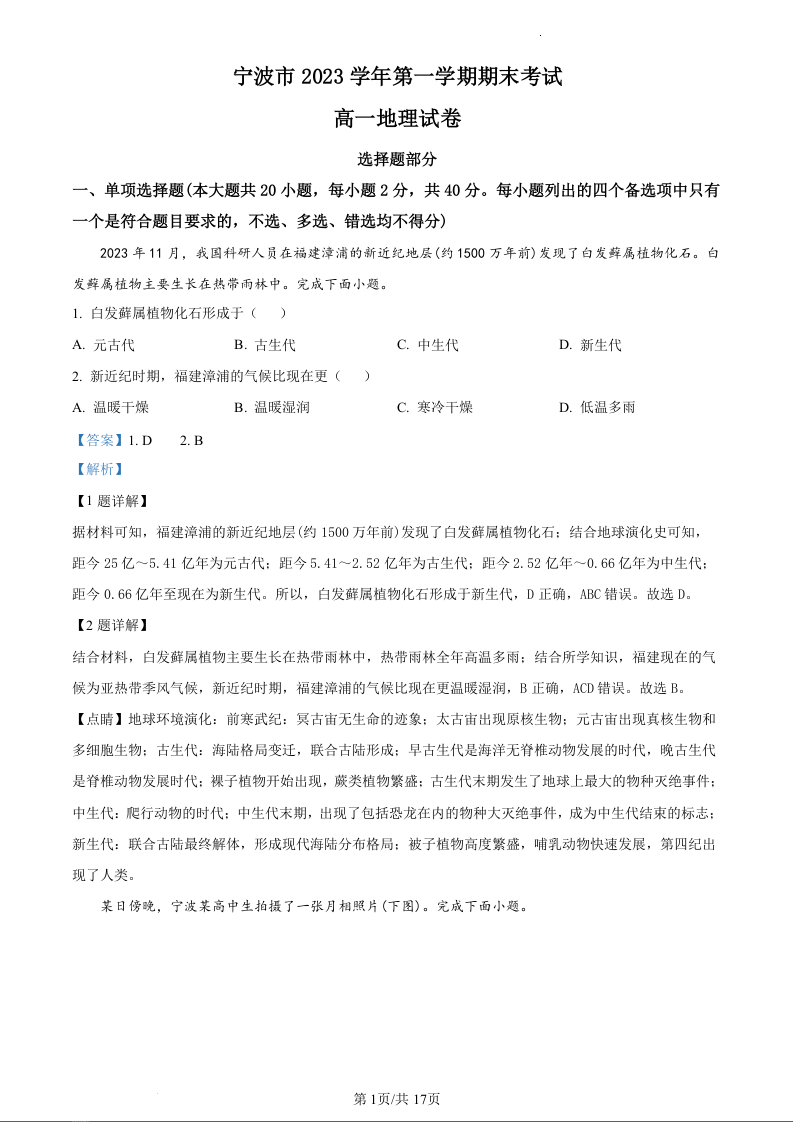 浙江省宁波市2023—2024学年高一上学期期末考试地理(精品解析版)