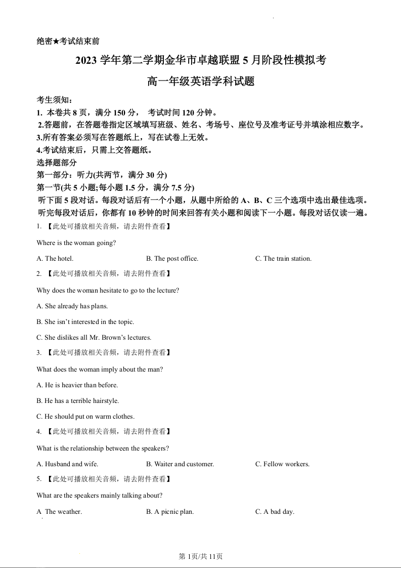 浙江省卓越联盟2023-2024学年高一下学期5月期中考试英语(原卷版)