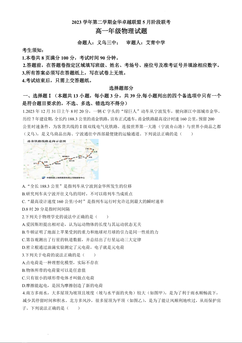 浙江省卓越联盟2023-2024学年高一下学期5月期中考试物理+答案