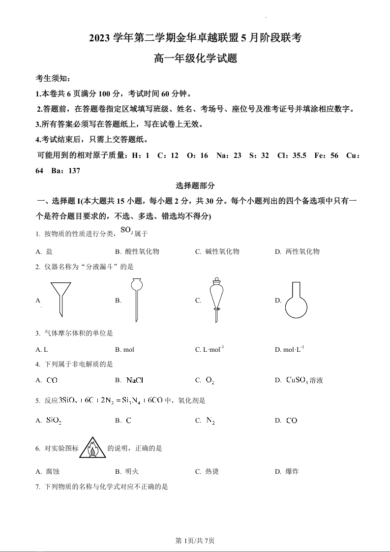 浙江省卓越联盟2023-2024学年高一下学期5月期中考试化学(原卷版)