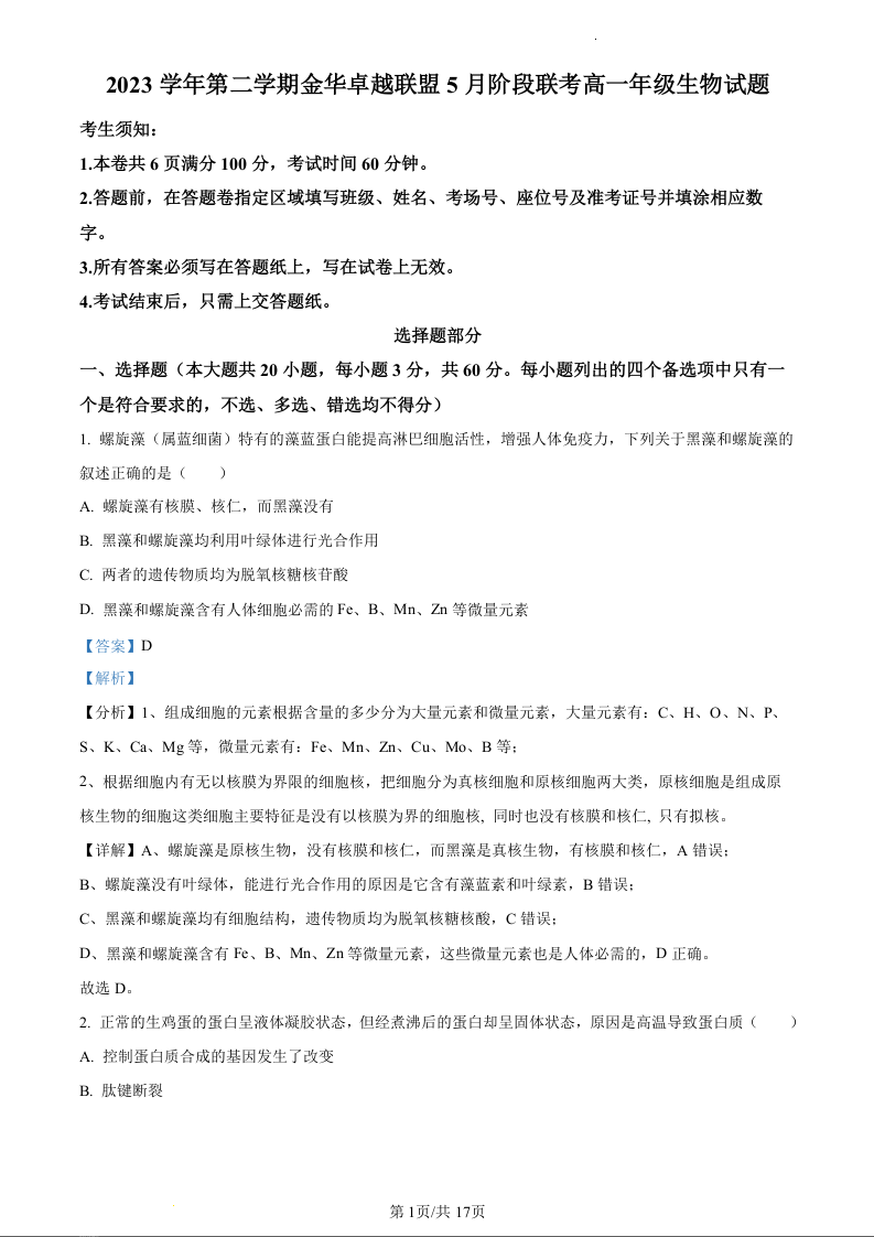 浙江省卓越联盟2023-2024学年高一下学期5月期中考试生物(精品解析版)