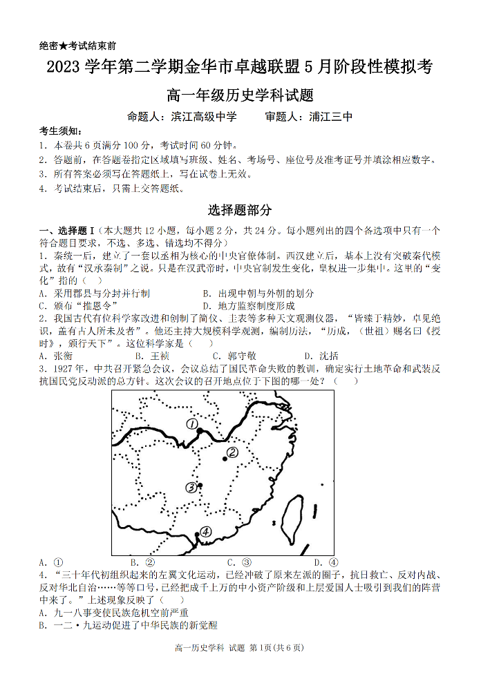 浙江省卓越联盟2023-2024学年高一下学期5月期中考试历史