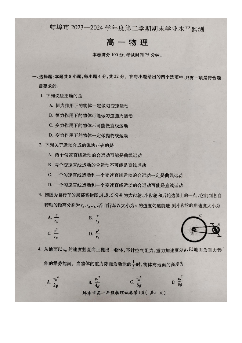 安徽省蚌埠市2023-2024学年高一下学期7月期末考试物理