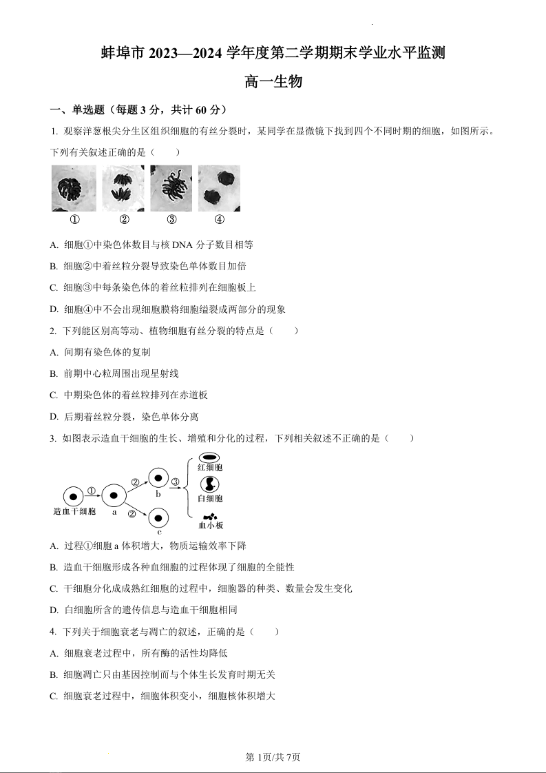 安徽省蚌埠市2023-2024学年高一下学期7月期末考试生物(原卷版)