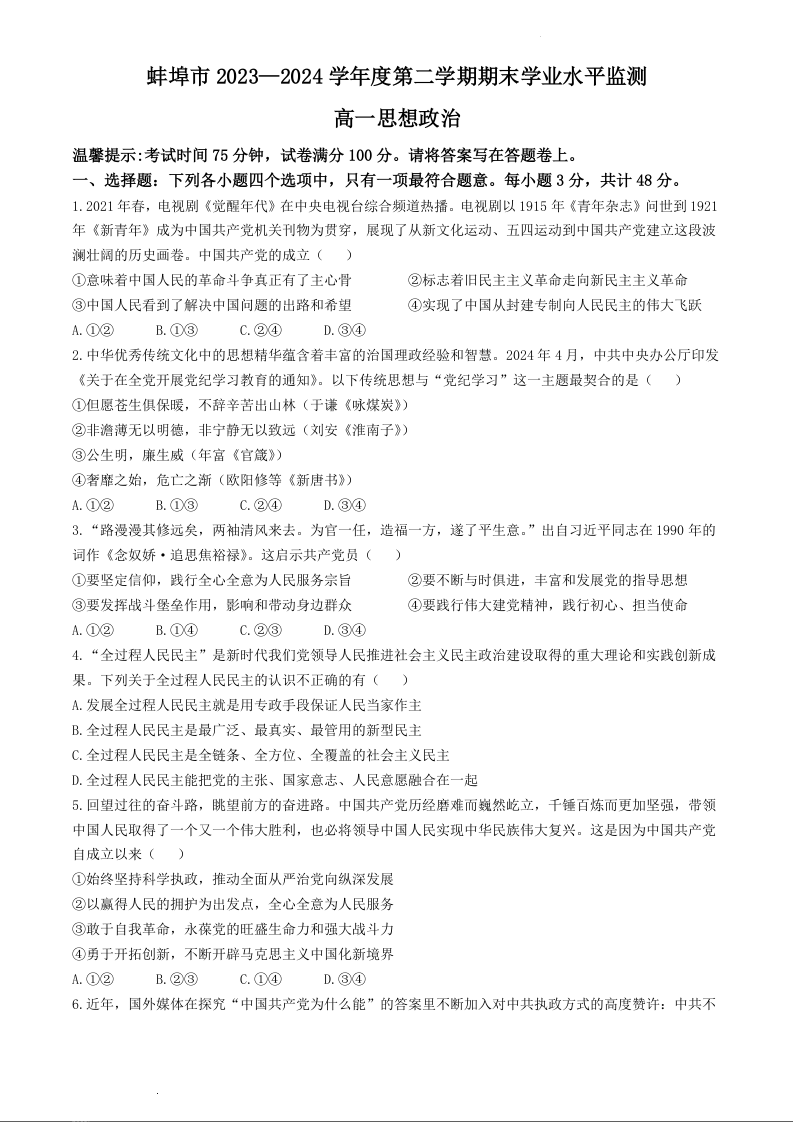 安徽省蚌埠市2023-2024学年高一下学期7月期末考试政治+答案