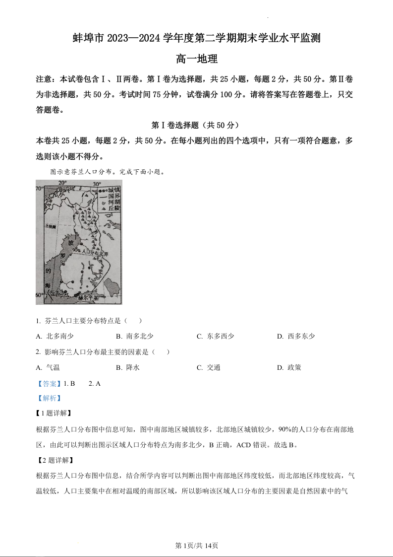 安徽省蚌埠市2023-2024学年高一下学期7月期末考试地理(精品解析版)