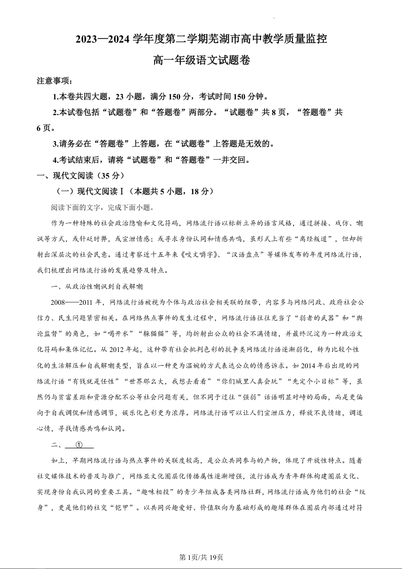 安徽省芜湖市2023-2024学年高一下学期7月期末考试语文(精品解析版)
