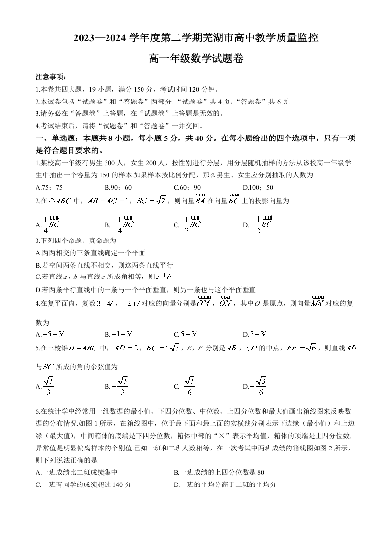 安徽省芜湖市2023-2024学年高一下学期7月期末考试数学+答案