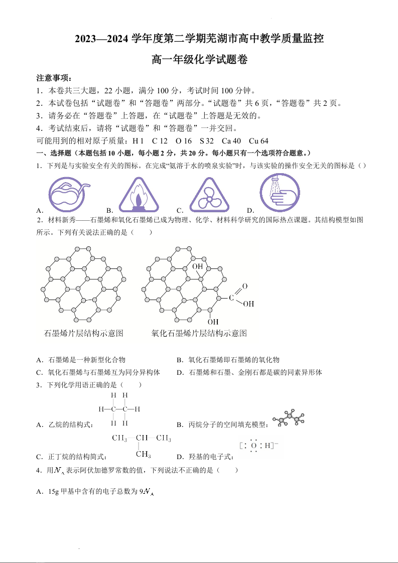 安徽省芜湖市2023-2024学年高一下学期7月期末考试化学+答案