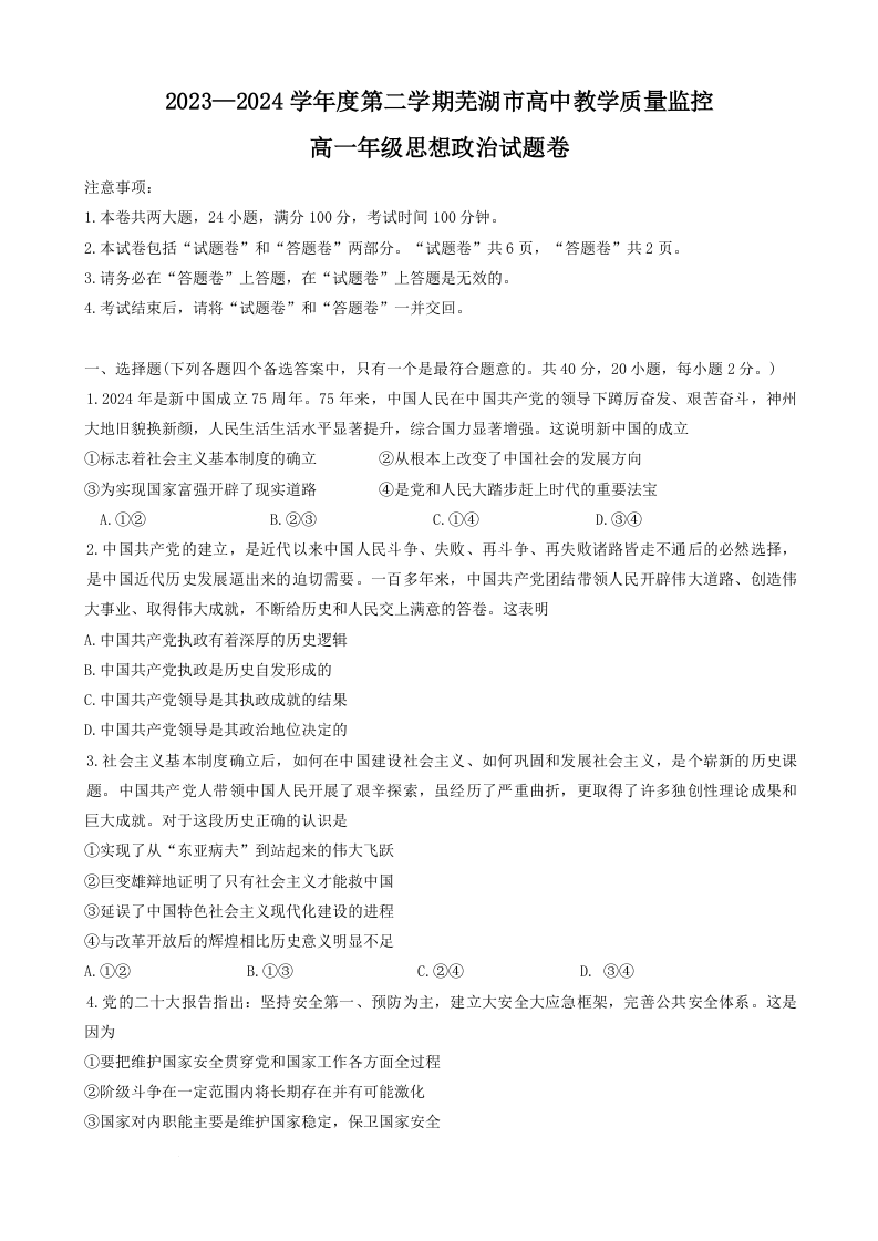 安徽省芜湖市2023-2024学年高一下学期7月期末考试政治