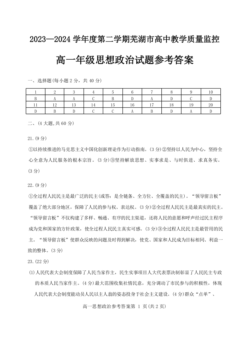安徽省芜湖市2023-2024学年高一下学期7月期末考试政治答案