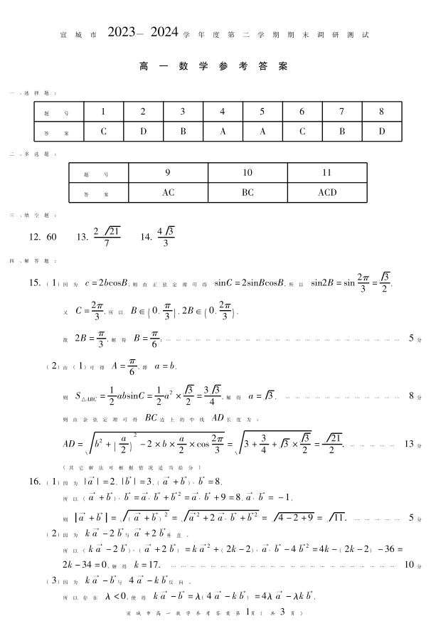 安徽省宣城市2023-2024学年高一下学期期末调研测试数学答案