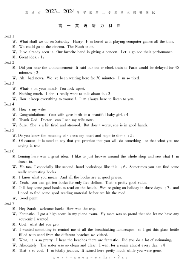 安徽省宣城市2023-2024学年高一下学期期末调研测试英语答案