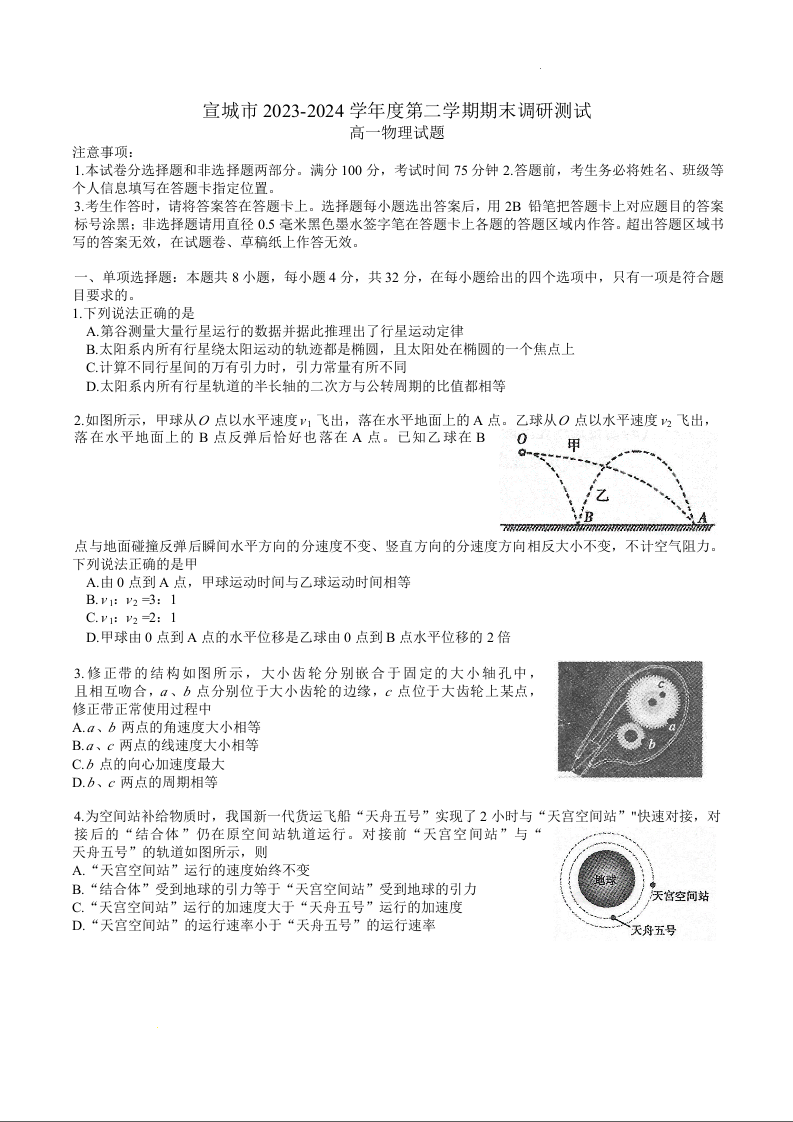安徽省宣城市2023-2024学年高一下学期期末调研测试物理