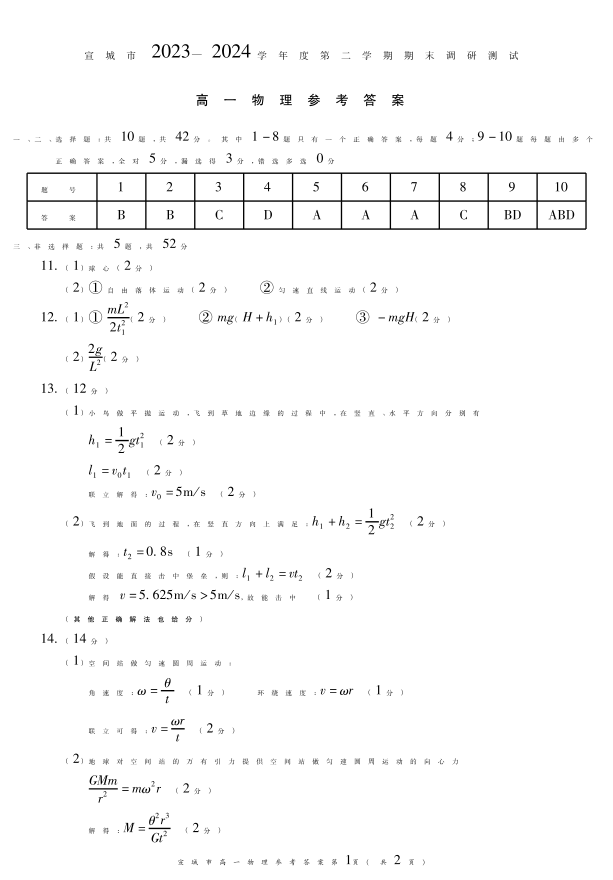 安徽省宣城市2023-2024学年高一下学期期末调研测试物理答案