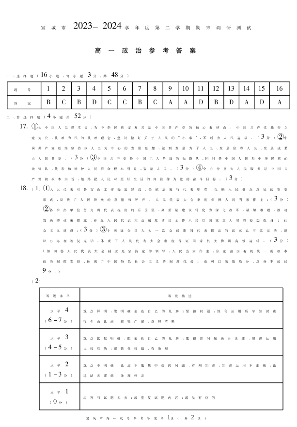 安徽省宣城市2023-2024学年高一下学期期末调研测试政治答案