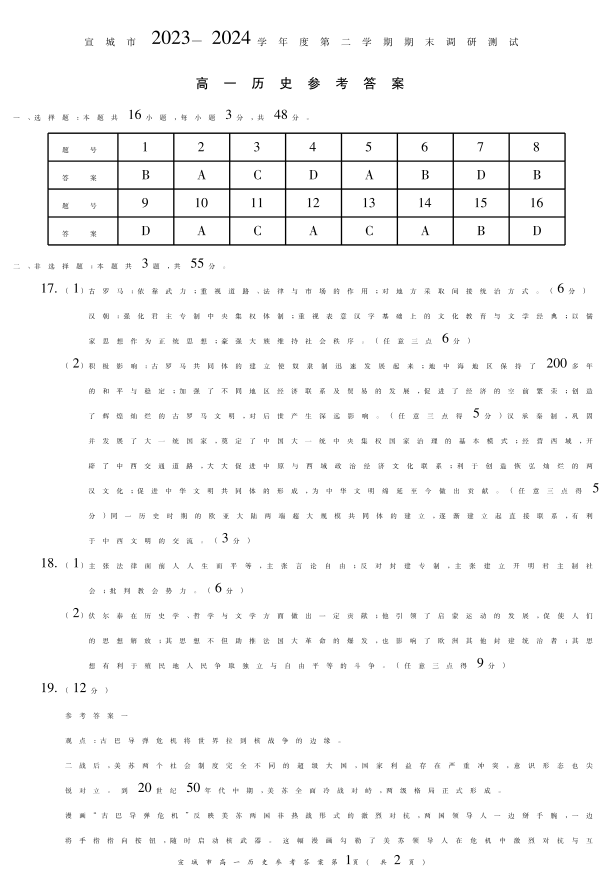 安徽省宣城市2023-2024学年高一下学期期末调研测试历史答案
