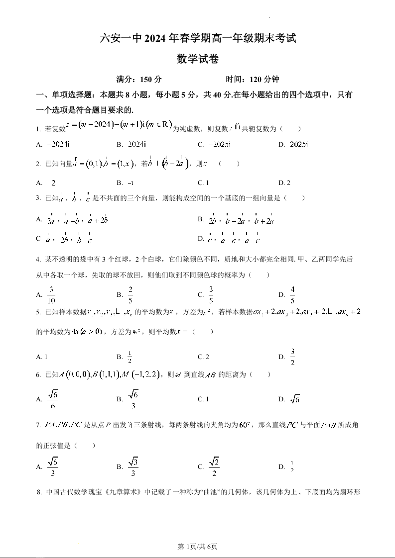 安徽省六安市六安第一中学2023-2024学年高一下学期6月期末考试数学(原卷版)