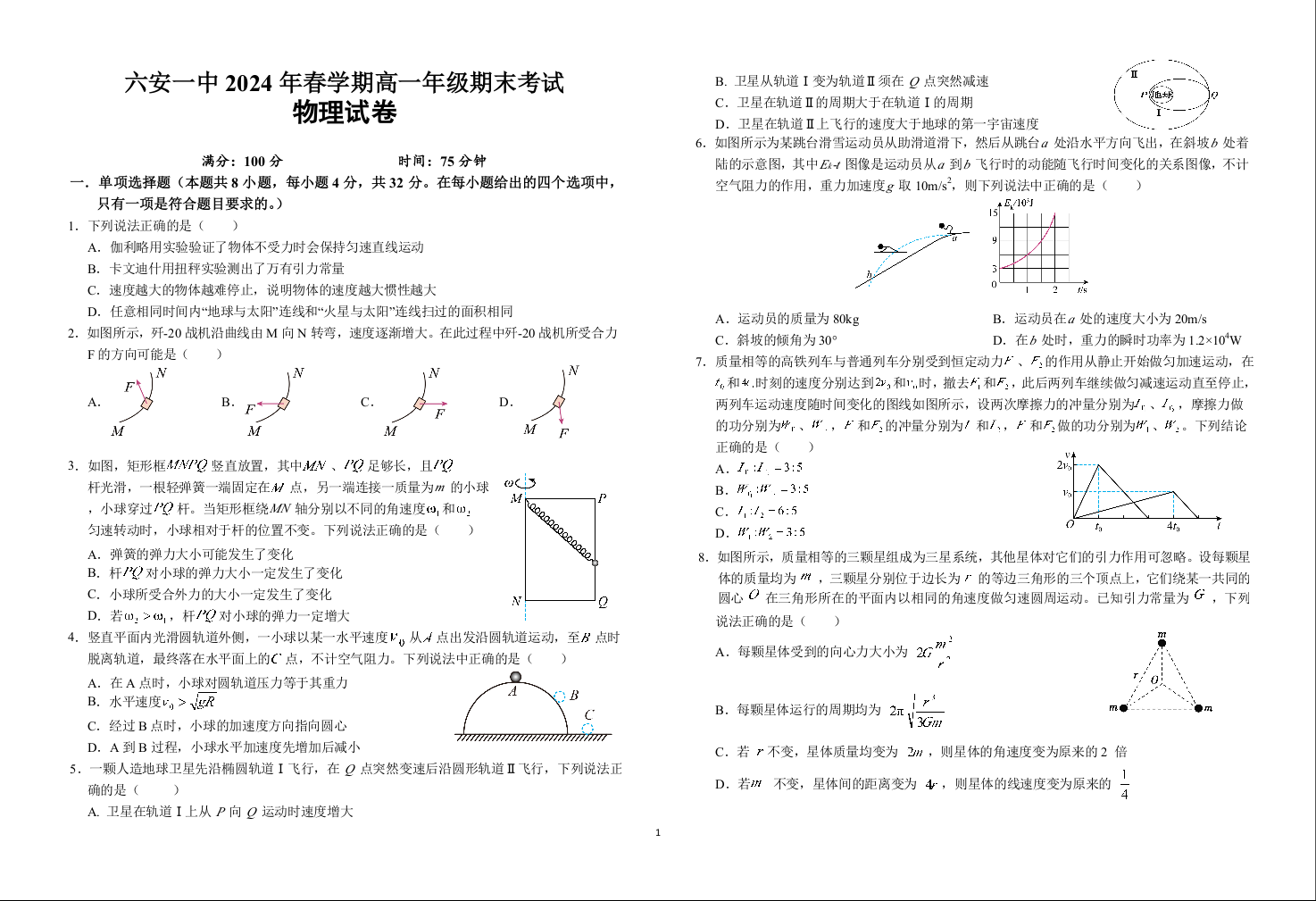 安徽省六安市六安第一中学2023-2024学年高一下学期6月期末考试物理+答案