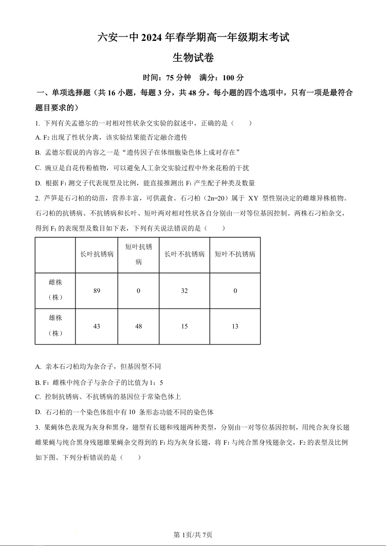 安徽省六安市六安第一中学2023-2024学年高一下学期6月期末考试生物(原卷版)