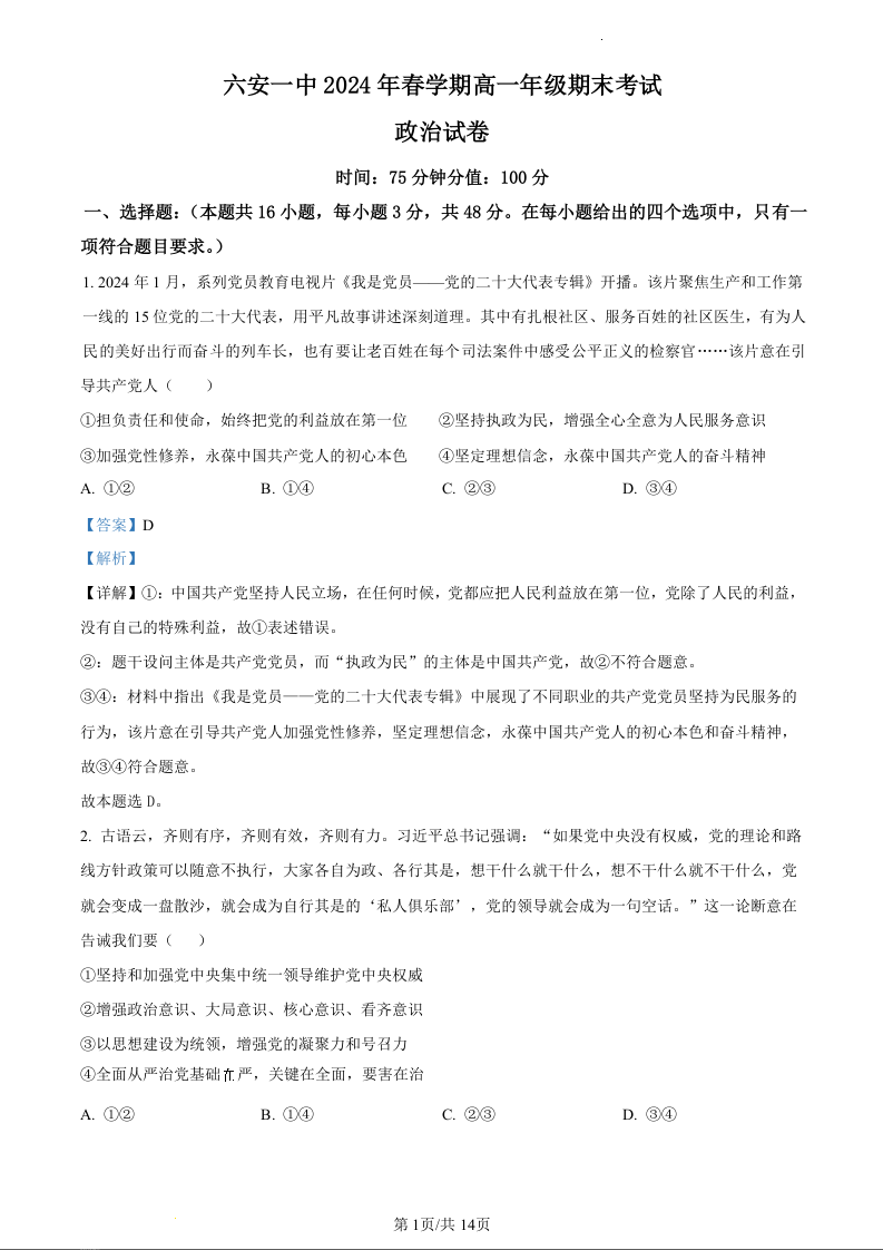 安徽省六安市六安第一中学2023-2024学年高一下学期6月期末考试政治(精品解析版)