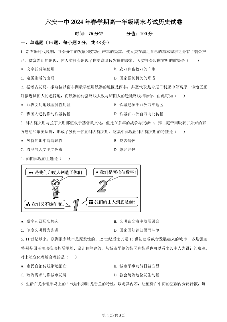 安徽省六安市六安第一中学2023-2024学年高一下学期6月期末考试历史(原卷版)