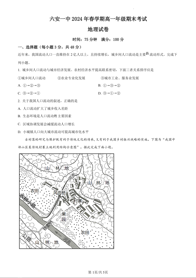 安徽省六安市六安第一中学2023-2024学年高一下学期6月期末考试地理(原卷版)