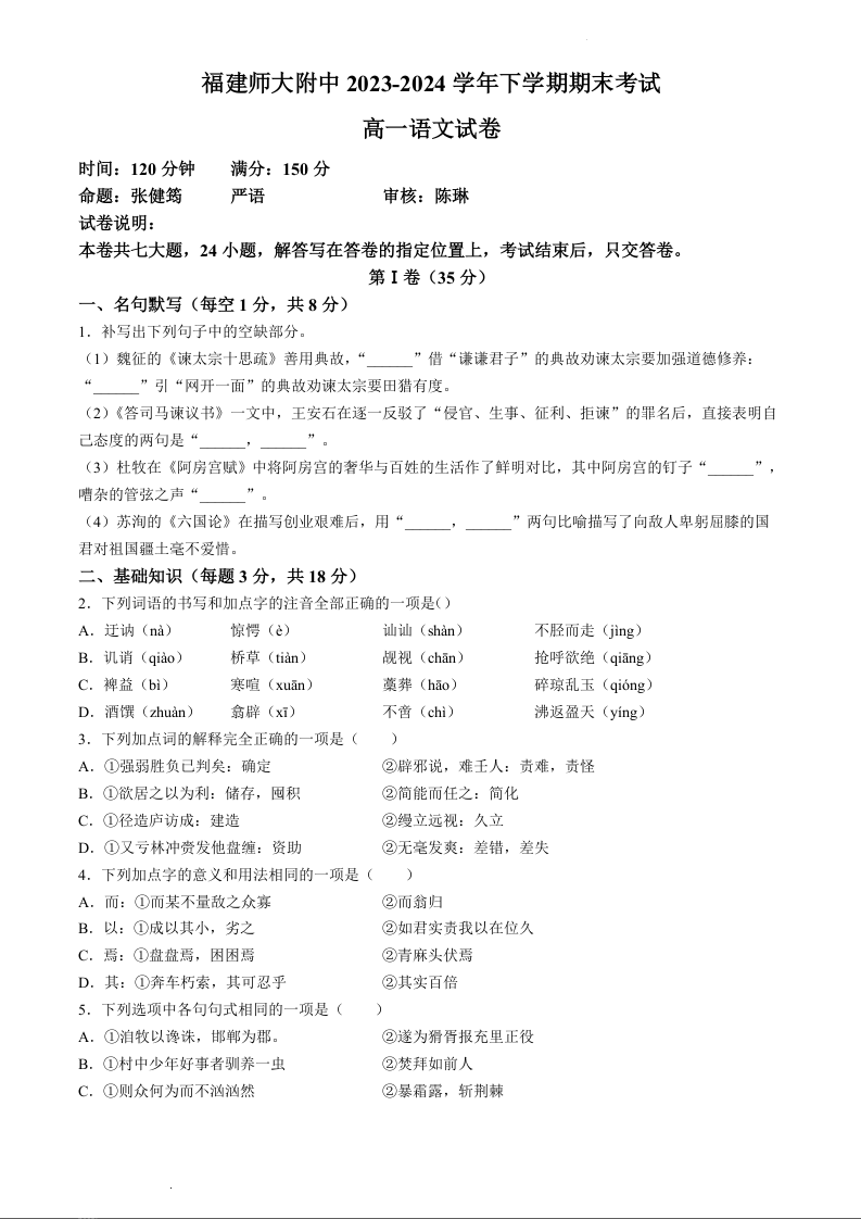 福建省福建师范大学附属中学2023-2024学年高一下学期7月期末考试语文+答案