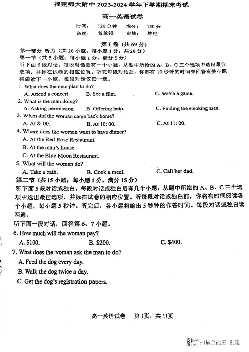 福建省福建师范大学附属中学2023-2024学年高一下学期7月期末考试英语