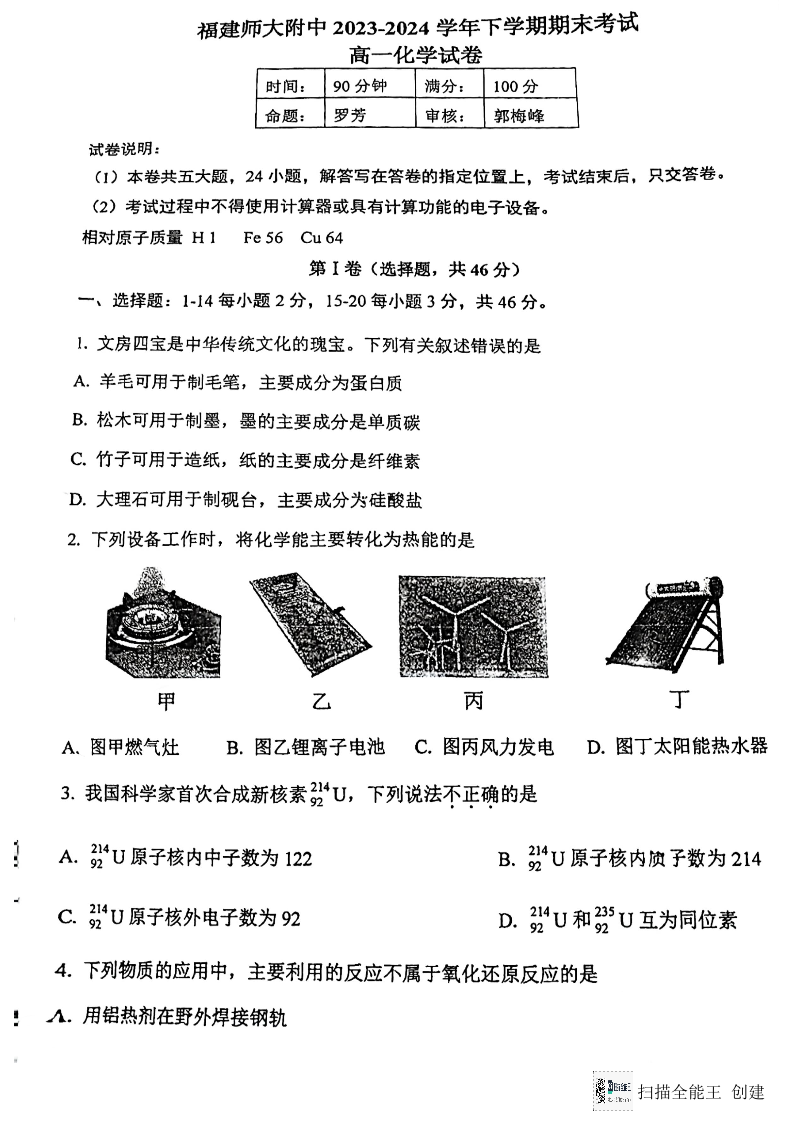 福建省福建师范大学附属中学2023-2024学年高一下学期7月期末考试化学