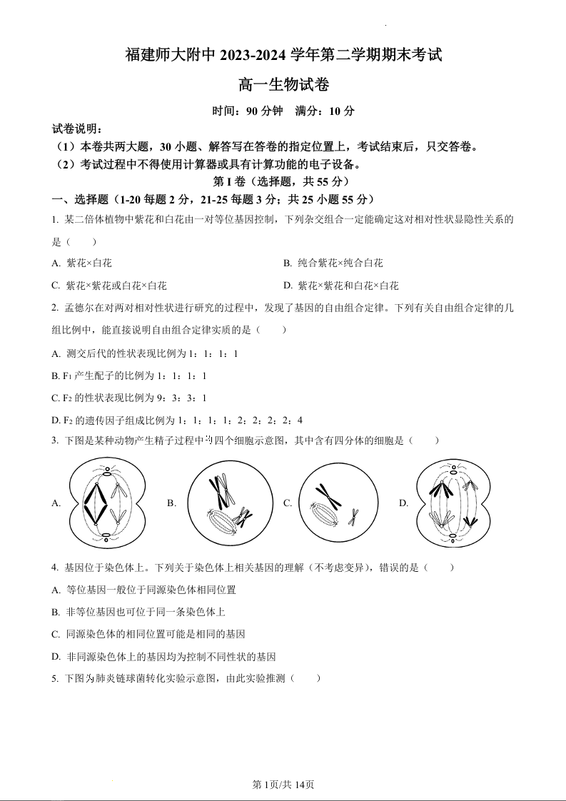 福建省福建师范大学附属中学2023-2024学年高一下学期7月期末考试生物+答案