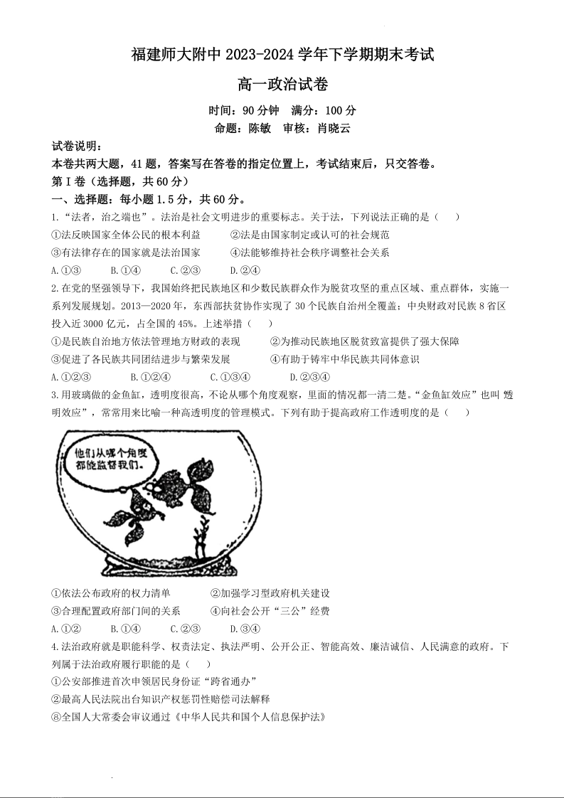 福建省福建师范大学附属中学2023-2024学年高一下学期7月期末考试政治+答案