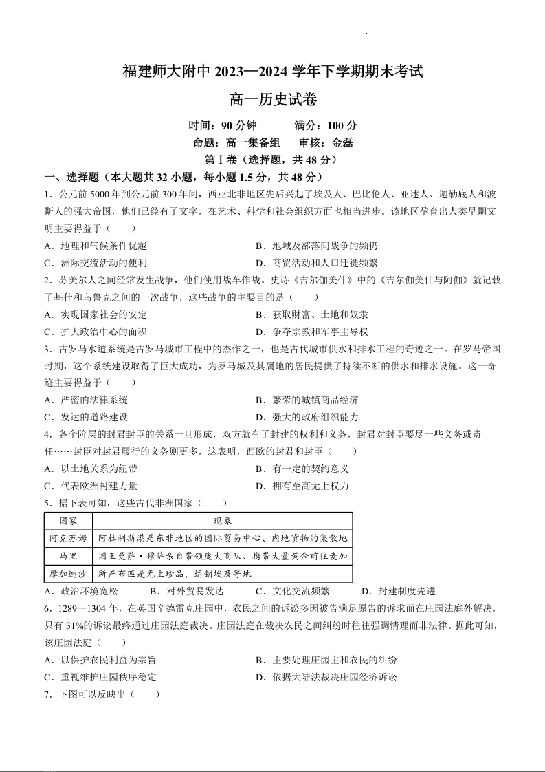 福建省福建师范大学附属中学2023-2024学年高一下学期7月期末考试历史+答案