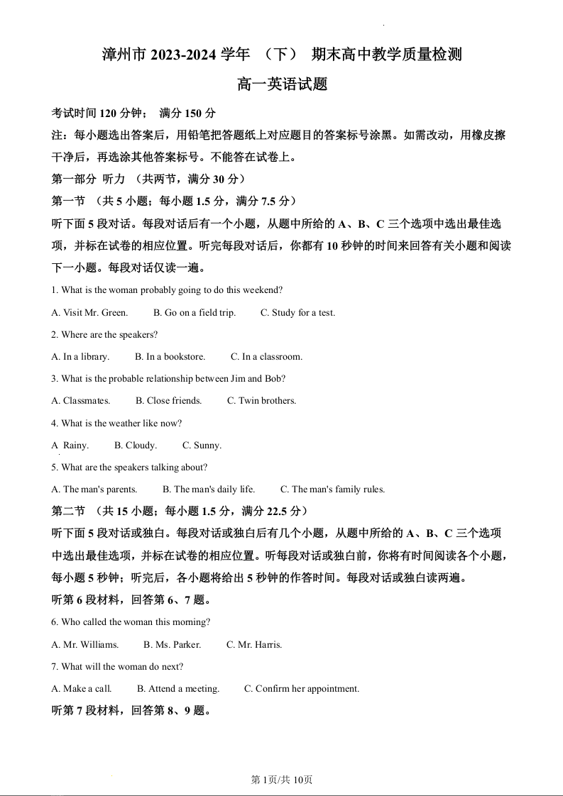 福建省漳州市2023-2024学年高一下学期期末教学质量检测英语(原卷版)