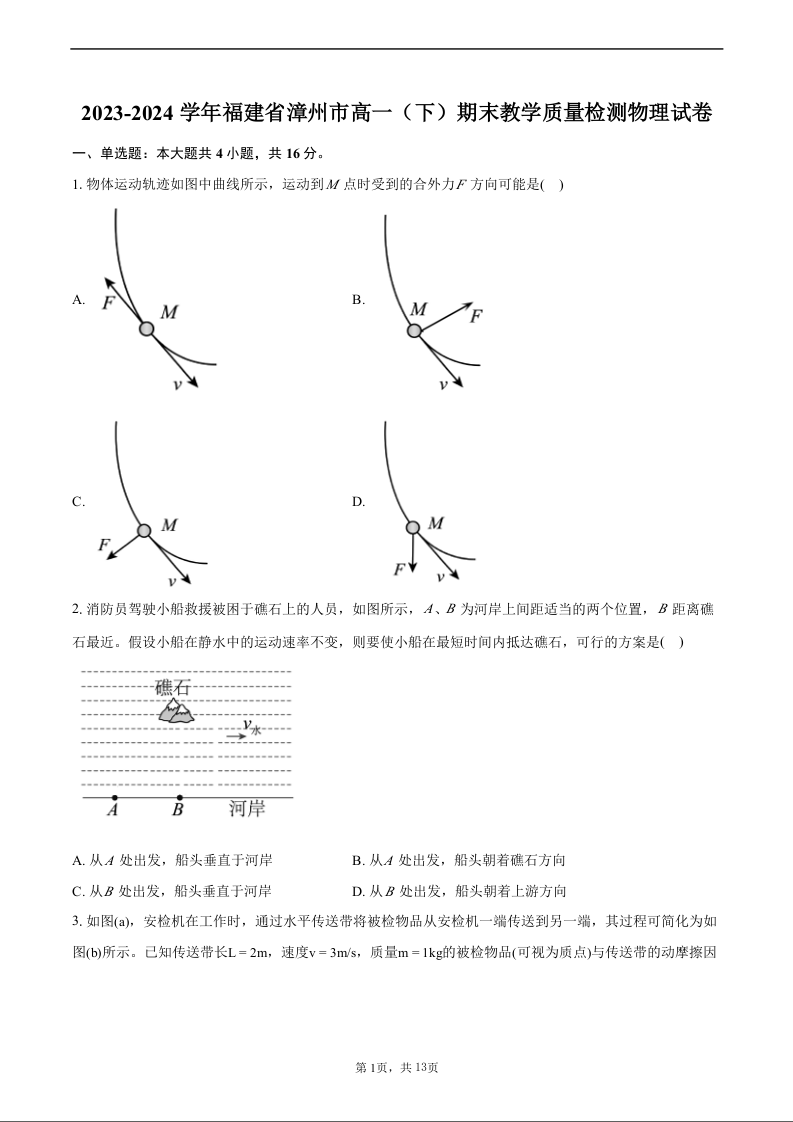福建省漳州市2023-2024学年高一下学期期末教学质量检测物理+答案