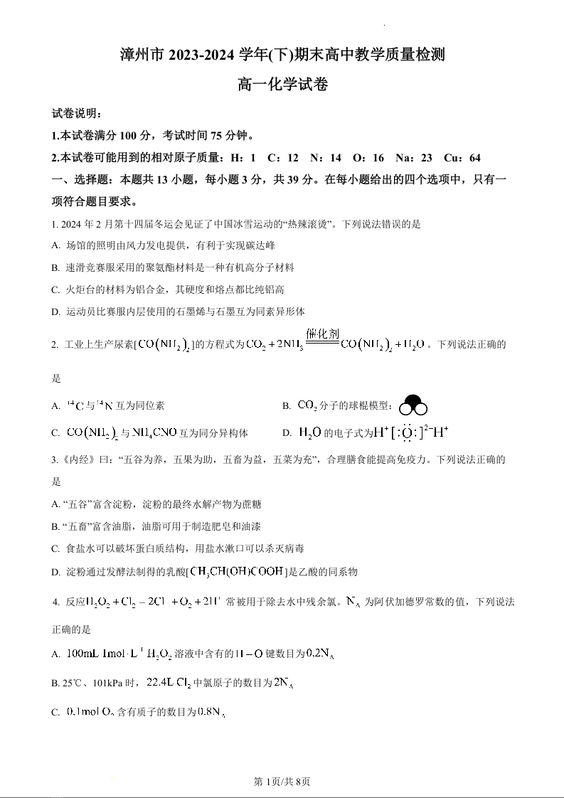 福建省漳州市2023-2024学年高一下学期期末教学质量检测化学(原卷版)