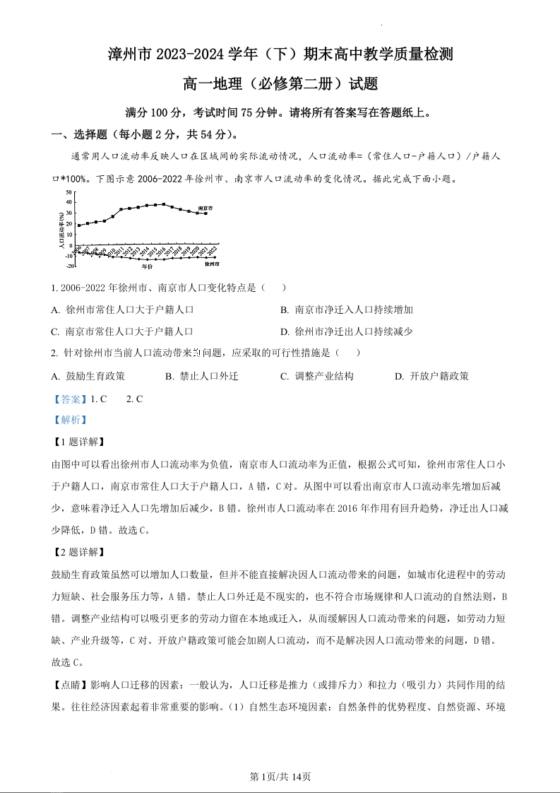 福建省漳州市2023-2024学年高一下学期期末教学质量检测地理(精品解析版)