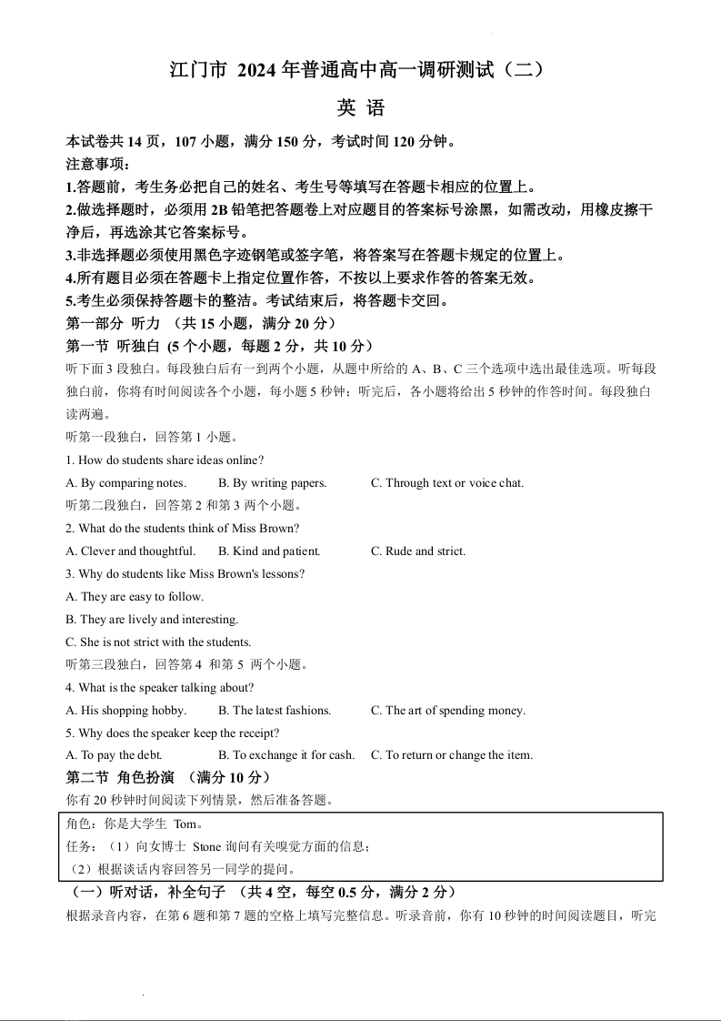 广东省江门市2023-2024学年高一下学期7月期末考试英语