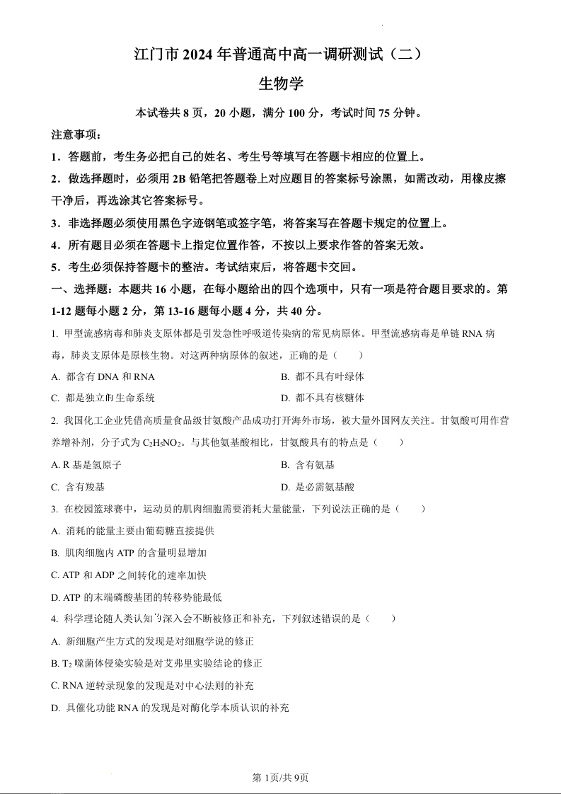 广东省江门市2023-2024学年高一下学期7月期末考试生物(原卷版)