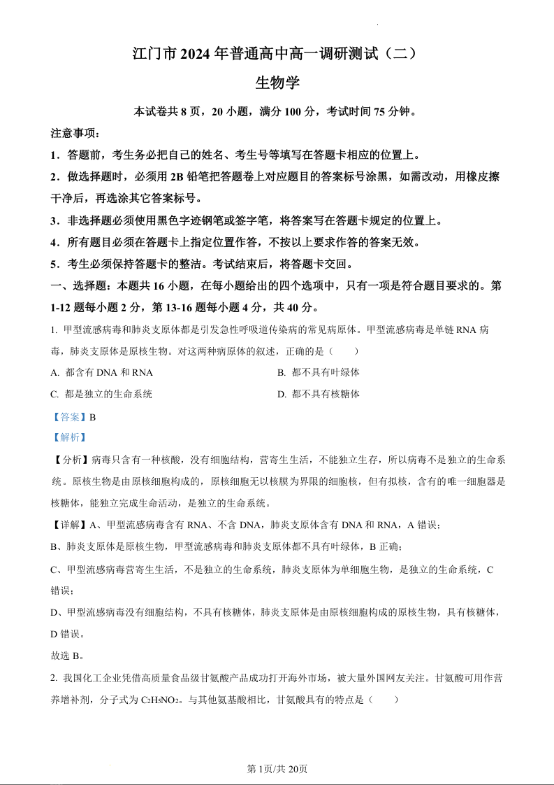 广东省江门市2023-2024学年高一下学期7月期末考试生物(精品解析版)