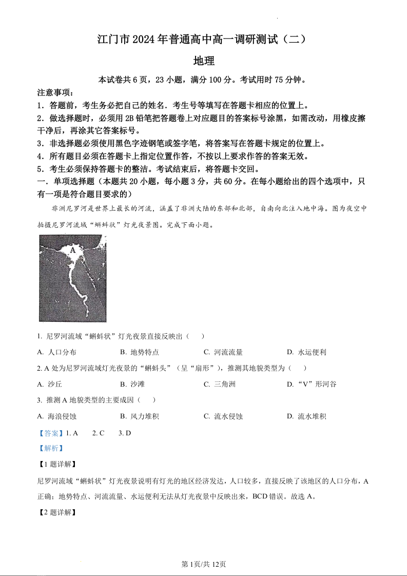 广东省江门市2023-2024学年高一下学期7月期末考试地理(精品解析版)