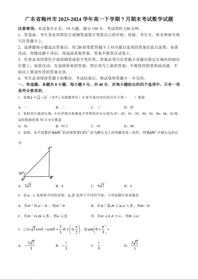 广东省梅州市2023-2024学年高一下学期7月期末考试数学