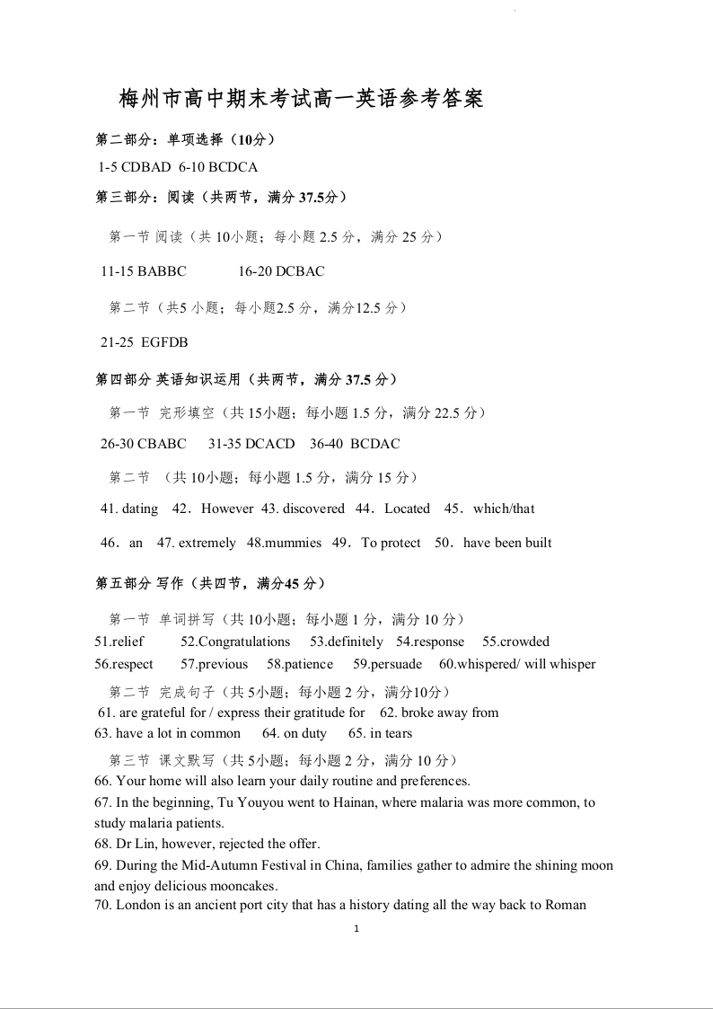 广东省梅州市2023-2024学年高一下学期7月期末考试英语答案