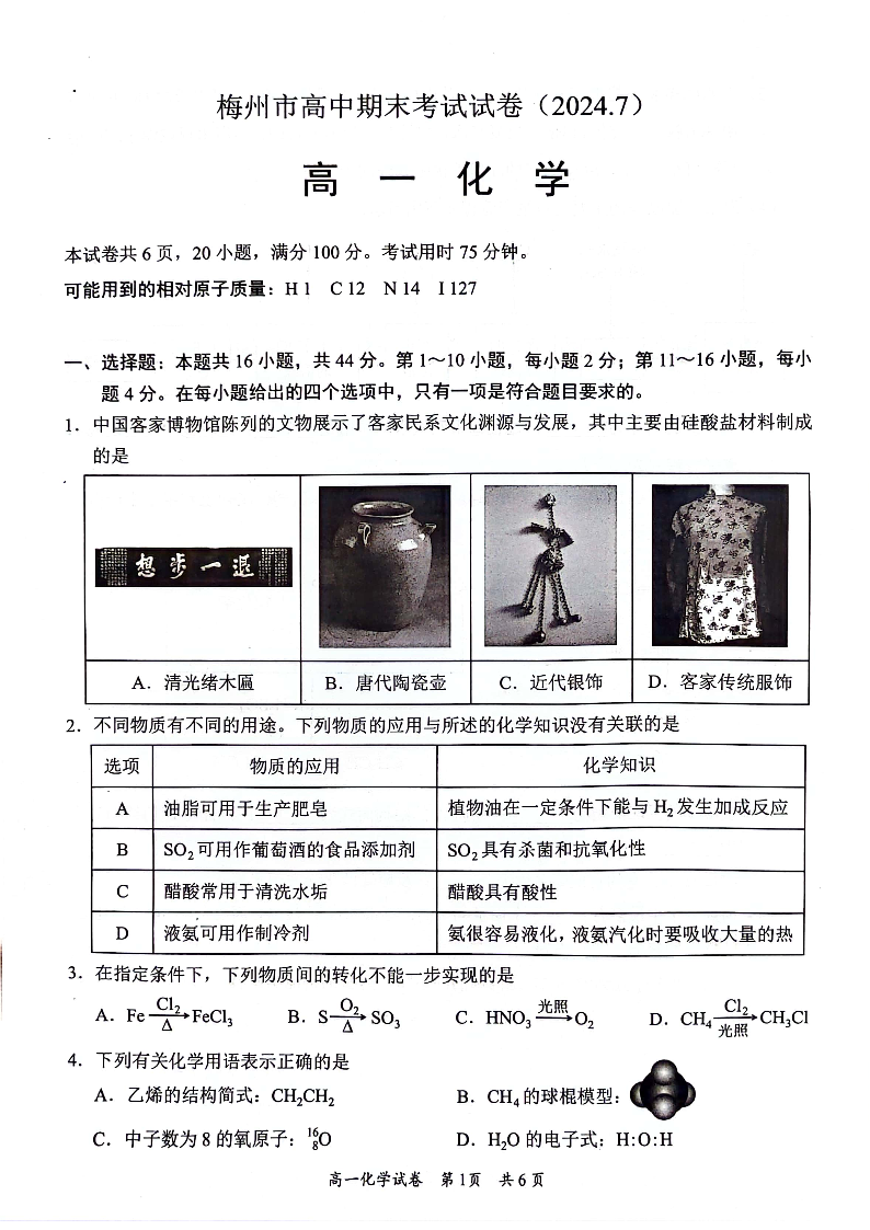 广东省梅州市2023-2024学年高一下学期7月期末考试化学