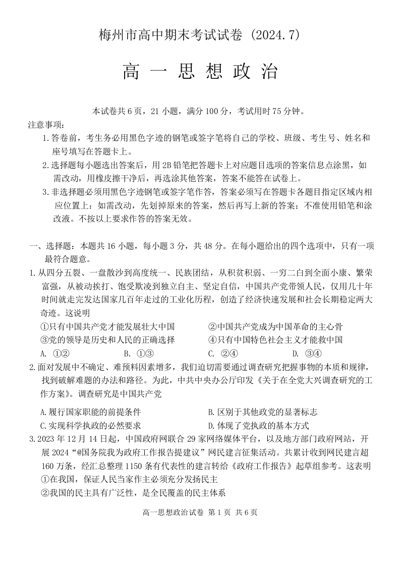 广东省梅州市2023-2024学年高一下学期7月期末考试政治