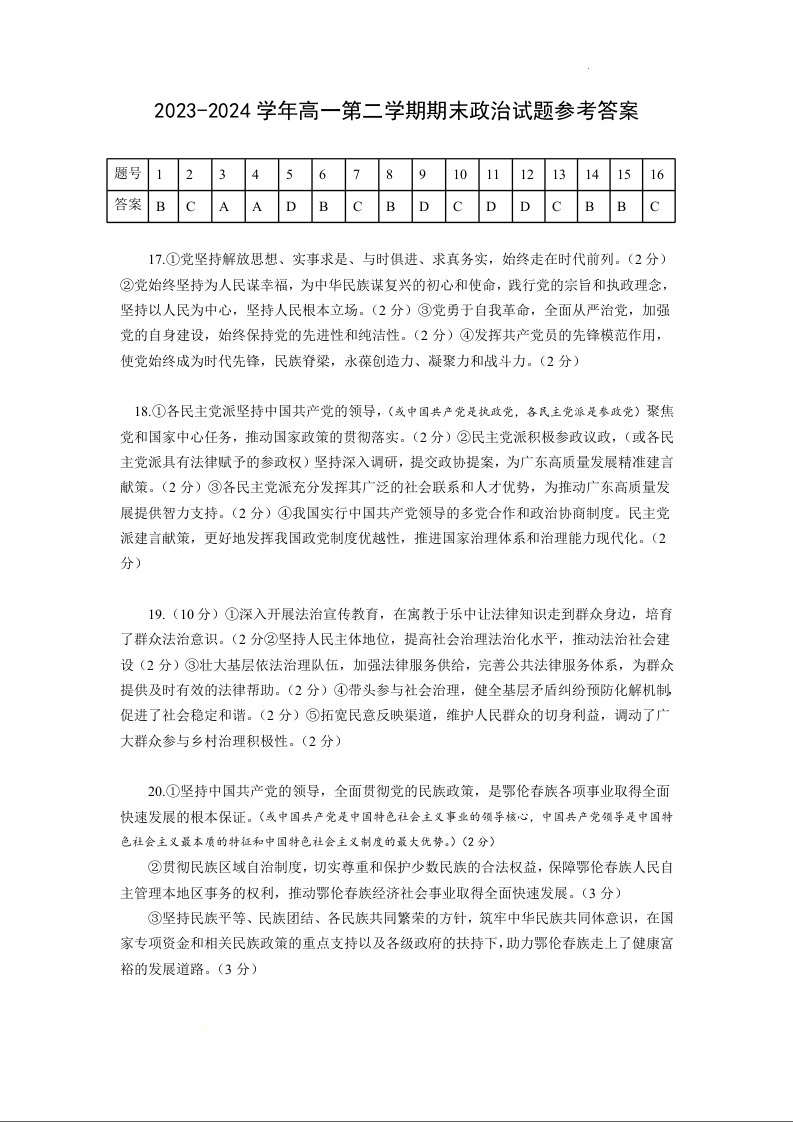 广东省梅州市2023-2024学年高一下学期7月期末考试政治答案