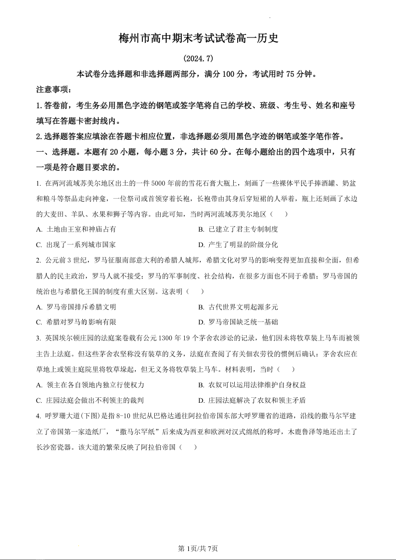 广东省梅州市2023-2024学年高一下学期7月期末考试历史(原卷版)