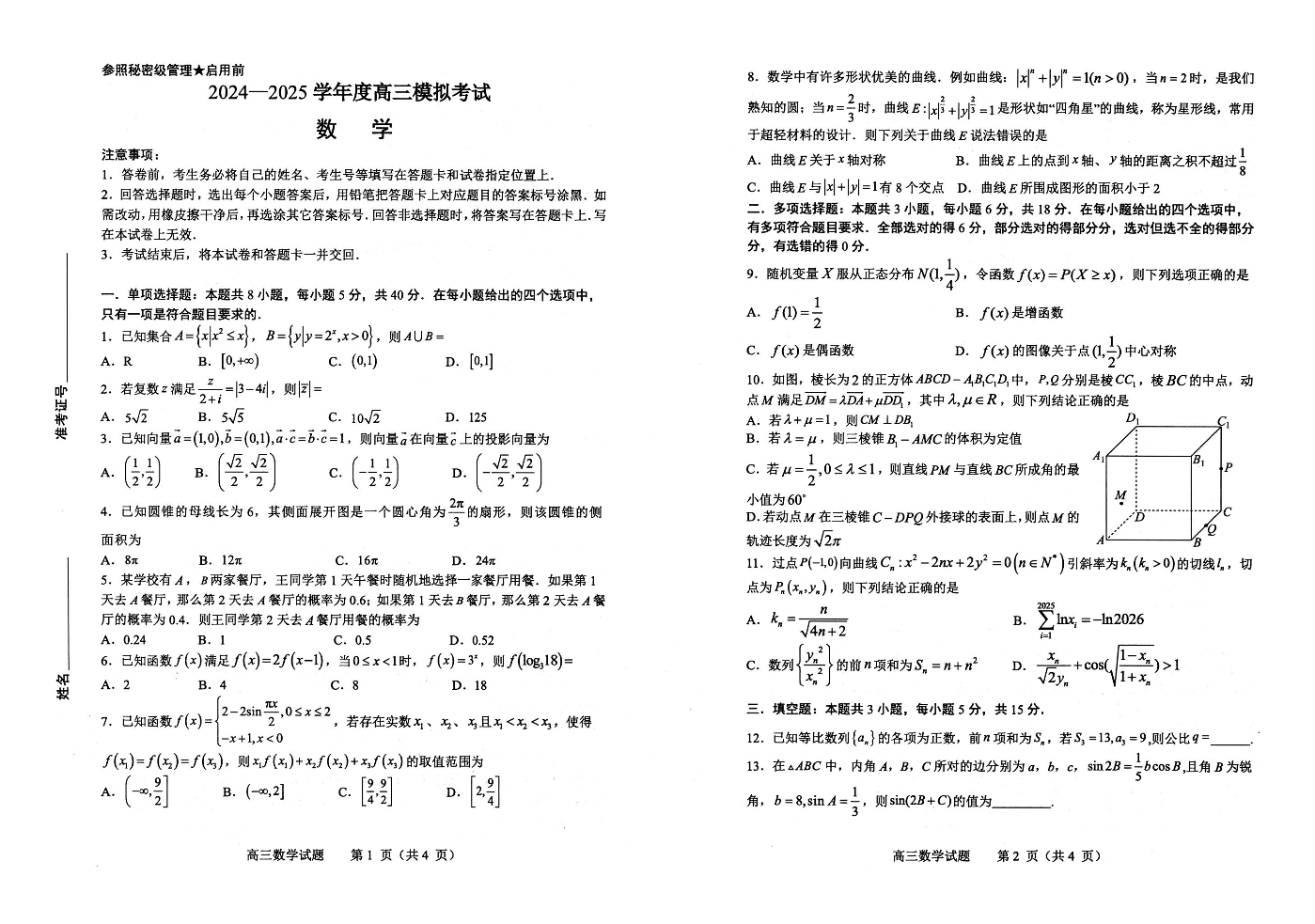 山东省淄博市2024-2025学年下学期3月高三一模统考数学