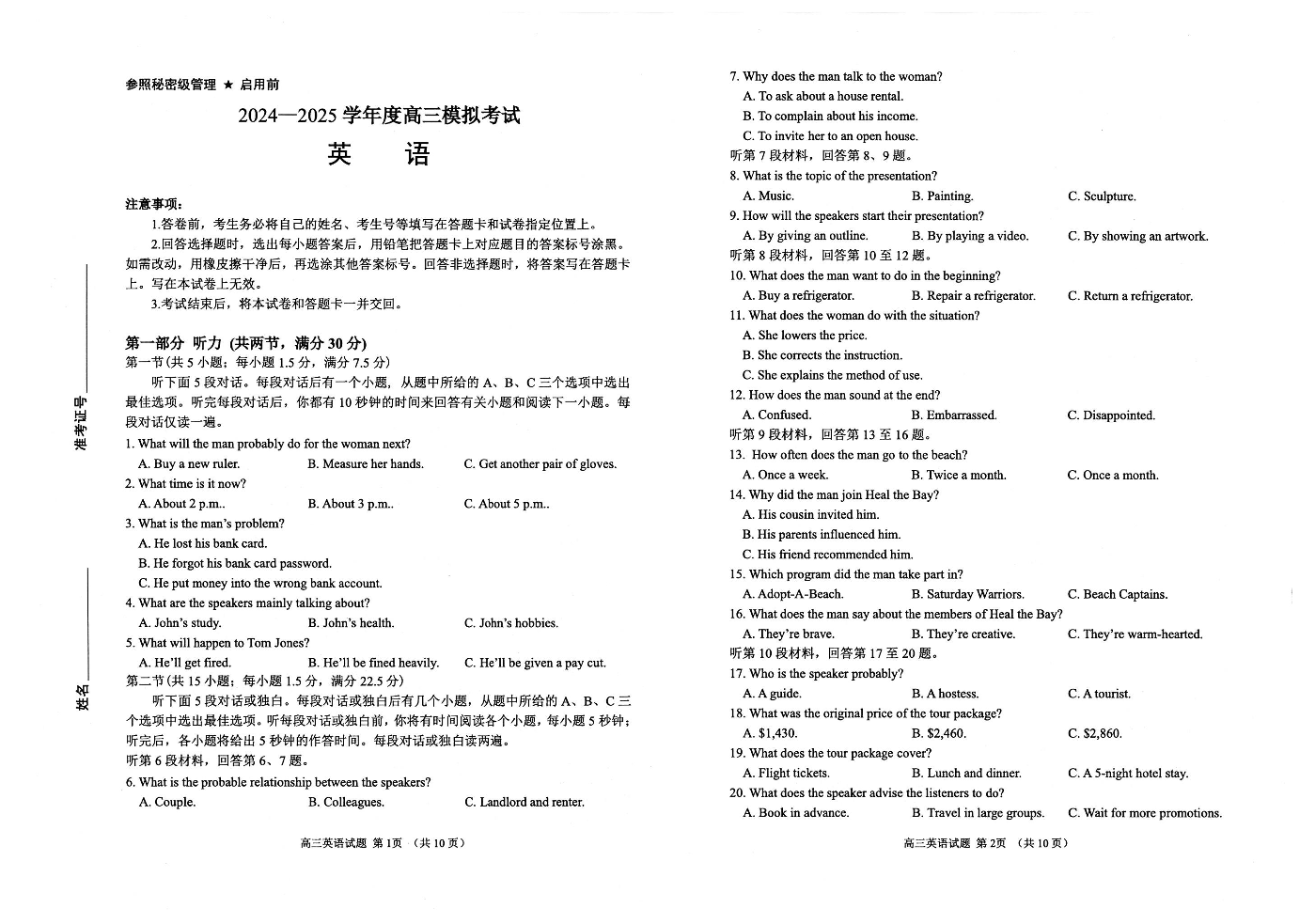 山东省淄博市2024-2025学年下学期3月高三一模统考英语