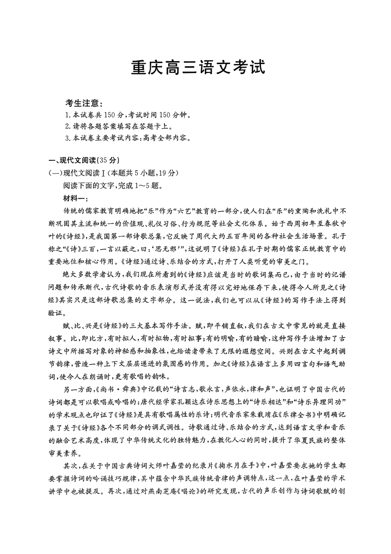 重庆市区域高中2024-2025学年下学期3月高三联考语文
